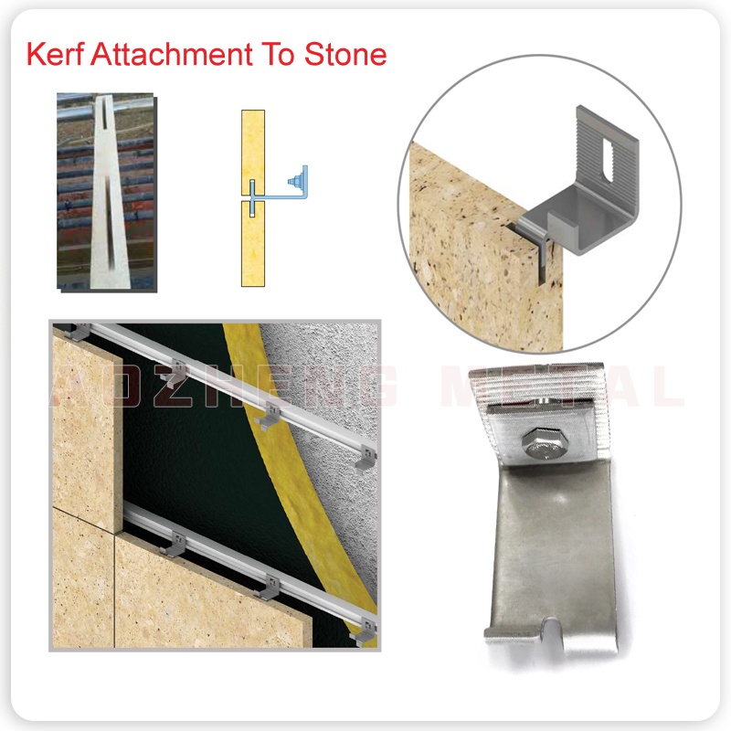 The Kerf attachment systemis the conventlonamethod for attachments made to stone. A pin hole or a kerf groove is opened at the edge of stonepanels. Plastic sieeves are used along with sutable resin to securely atach the pin or kert in place. the use ot this system is applcable for stonethickness of3 cm and above, depending on the strength ofthe stone. A breaking load test at pin or ker areas may be necessary to determine the correctthickness of stone panels that may differ for different natural stone types.